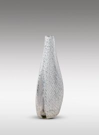Vetro incolore decorato all'interno con merletto bianco spezzato da due denti cristallo, corpo a forma di goccia schiacciata con sezione triangolare