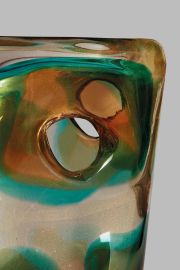 Vetro cristallo e oro con macchie irregolari in vetro verde e ambra trasparente, corpo troncoconico con tre larghi fori nella parte superiore