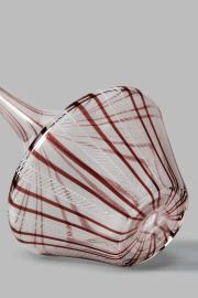 Clear glass vertically decorated with diagonal segments of white threads alternating with amethyst threads
