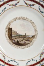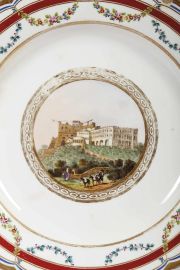 L’assortimento di piatti di porcellana mostra un decoro con vedute comprese in un medaglione centrale e circondate, sulla tesa, da ghirlande fiorite e da una bordura filettata in blu e rosso. La porcellana è tenera e mostra alcuni segni e qualche sofferenza d’uso: crettature, sbecchi e sottili felature. L’oro non sempre in perfetto stato di conservazione su tutti gli esemplari, mentre è inalterata la freschezza delle vedute al centro della composizione. Da segnalare alcuni dettagli visibili nei decori secondari realizzati in manifattura, quali la mancanza di alcune bacche nella ghirlanda del piatto con Veduta del Golfo di Messina, che inoltre mostra la veduta principale disassata rispetto alla scritta posteriore.