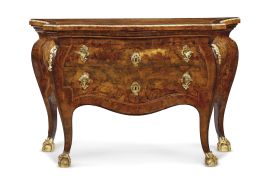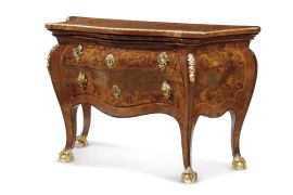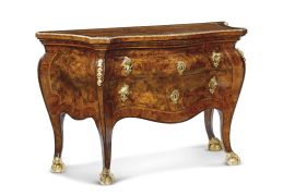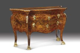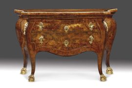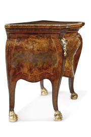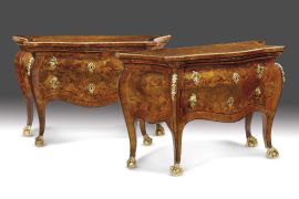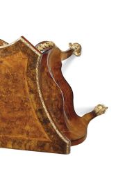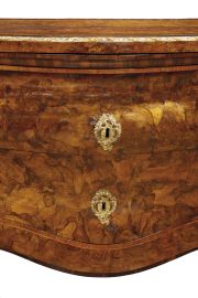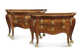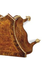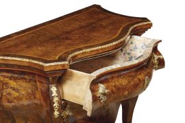 Quasi a contrastare la predilezione per il senso di simmetria che aveva caratterizzato il Seicento, con mobili che spesso richiamano nella composizione forme architettoniche, nel secolo dei Lumi le linee si volgono in movimenti veloci e spesso arditi, in un gioco continuo di pieni e di vuoti, di chiari e di scuri, talvolta esaltato dall’alternanza di legni diversi per tipologia e colori. Un movimento dove non c’è spazio per la linea retta, a meno che non si tratti di contrastare il gioco di una curva: è il caso dei piani dei cassettoni qui proposti, il cui dolce andamento ondulato trova una netta interruzione negli angoli scantonati, in un effetto rafforzato dai contrasti cromatici creati dalle due tipologie di radica intervallate da una profilatura in legno chiaro, il tutto racchiuso entro un profilo in legno dorato intagliato a motivi di ovoli alternati a bacchette oblique, a richiamare le profilature in bronzo.