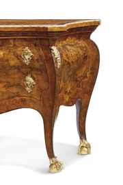 Tanto per la forma quanto per la presenza di applicazioni dorate in foggia di elementi vegetali ad impreziosire le bocchette, le maniglie e la parte alta degli spigoli, i nostri cassettoni trovano significativi confronti con la produzione romana di metà Settecento realizzata per importanti committenze. Confrontabili con il comò Boncompagni-Ludovisi (vedi fig. 1) sono le ricche applicazioni in legno e bronzo dorato che, unitamente all’impiego di diverse essenze di legno, conferiscono preziosità ai mobili, mentre la forma del piano, sebbene nel nostro caso realizzato in radica anziché in marmo, con la tipica profilatura a ovoli, insieme al profilo rigorosamente curvilineo a creare pieni e vuoti che dal fronte si muove lungo gli angoli e ancora alla linea sagomata dei cassetti che segue ed esalta l’andamento del corpo, avvicina i nostri esemplari a quello della Raccolta F. Tuena (vedi fig. 2).