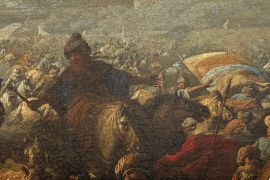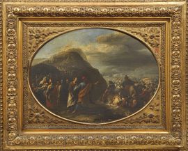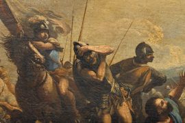A mezza via tra il genere della storia biblica e della scena di battaglia, le due inedite tele qui presentate si iscrivono con ogni evidenza nella pittura napoletana del quarto decennio del secolo, non senza qualche riferimento, per quanto riguarda la Caduta di San Paolo, alla produzione coeva del romano Michelangelo Cerquozzi: di quest’ultimo si può infatti citare la tela di uguale soggetto e molto simile nella composizione a Roma nella Galleria Nazionale di Arte Antica (cfr. Laura Laureati, Michelangelo delle Battaglie, in “Paragone” 1993, 523-525, p. 57 e fig. 31). Numerosi elementi richiamano tuttavia in maniera più specifica l’opera giovanile di Salvator Rosa – a cui, non a caso, le nostre tele erano attribuite nella raccolta di provenienza – e in particolare alcune scene di battaglia dipinte nel 1637-38, appunto tra Roma e Napoli. Ci riferiamo in particolare alla notissima Battaglia siglata e datata del 1637, un tempo nella raccolta Mostyn Owen e poi in collezione privata francese, che a lungo ha costituito il punto di partenza per la ricostruzione del corpus giovanile dell’artista napoletano, e a un’altra scena di battaglia a Roma, Galleria Nazionale di Arte Antica. Da ricordare, anche le storie mosaiche dipinte da Aniello Falcone sul soffitto di una sala della villa di Gaspar Roomer a Barra, documentata dl 1642-43, in cui compare l’episodio del Passaggio del Mar Rosso.