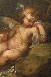 Esemplato sul celebre gruppo scultoreo conservato nella Biblioteca Piccolomini a Siena e ripreso anche da Raffaello nel dipinto ora a Chantilly, Musée Condé, dalla collezione di Scipione Borghese, il motivo delle Grazie accompagnate da Amore in un paesaggio compare, appena variato, nel noto dipinto a Roma alla Galleria Borghese (inv. 527; olio su tela, cm 35x41,5) di cui la nostra inedita tela costituisce una replica variata, o forse una prima versione. Oltre che gli elementi paesistici, in entrambi i casi esemplati sui modelli di Paul Bril, le differenze riguardano i visi delle Grazie, la posizione della faretra di Eros addormentato, e soprattutto la figura di un secondo amorino Anteros (?) in alto a sinistra nella versione romana.
