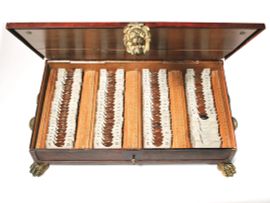 medagliere in legno, cm 20,7x68x34, piedi a zampa leonina e cerniera a testa leonina in bronzo dorato. Sul dorso del cofanetto scritta composita con lettere in bronzo dorato che dice: STORIA METALLICA DI CASA SAVOIA.