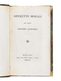 FIRST EDITION of this fundamental and splendid Leopardi work, printed by Manini in June 1827, after troubled editorial events. The collection includes 21 prose texts, 18 of which previously unpublished.