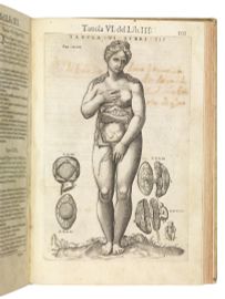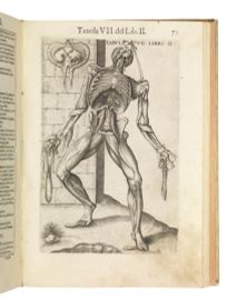CELEBRE TESTO DI ANATOMIA, seconda edizione italiana, ma la prima a contenere le quattro tavole relative ai muscoli aggiunte tra le carte 82-83. Originariamente pubblicato in spagnolo nel 1556, questo trattato scritto dal maggior anatomista spagnolo dell’epoca si ispirava molto alla Fabrica di Andrea Vesalio, ma ne correggeva anche vari errori, aggiungendo nel contempo nuove conoscenze. Le tavole sono splendidamente realistiche e giustamente famose.