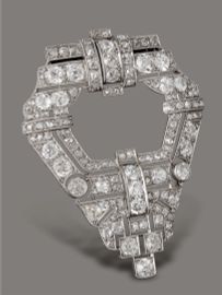 a motivi geometrici con microperlinatura e traforatura in cui sono incastonati diamanti taglio vecchio per ct 6 circa e diamanti taglio rosa per ct 1 circa, dim. cm 6x5, g 33
