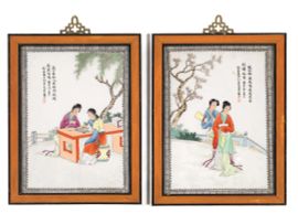 In porcellana policroma, raffiguranti personaggi con iscrizioni; cornice cm 35,5x26 (4)