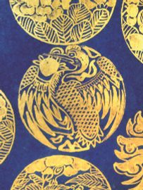 a forma di bottiglia decorato con medaglioni dorati contenenti fiori fenici e oggetti preziosi; alt. cm 39