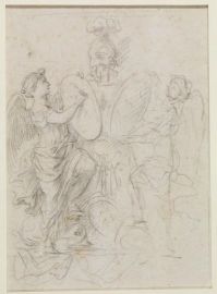 L'attribuzione al Romanelli è stata confermata da Jörg Merz: lo studioso ha inoltre messo in relazione il disegno con le due figure allegoriche con l'affresco che si trova alla sinistra della scena Guerra e Pace del salone della Pace nell'appartamento di Anna d'Austria del palazzo del Louvre (cfr. Y. Loskoutoff, Le cardinal et les vertus cardinales : autour de la glorification de la France de Giovanni Francesco Romanelli, in Mazarin les lettres et les arts, a cura di I. de Conihout e P. Michel, Parigi 2006, fig. 8).