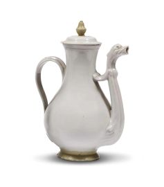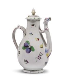 in porcellana bianca, una con corpo piriforme con versatoio a collo di cigno con ponticello, coperchio a disco con pomello a pigna, alt. cm 22; l'altra dipinta in policromia secondo il tipico decoro denominato “a fiori e frutta sparsi”, corpo piriforme, versatoio a collo di cigno, coperchio a disco con pomello a pigna, alt. cm 24,5