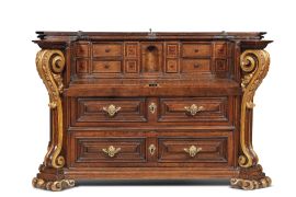 in noce parzialmente dorato, piano di linea spezzata apribile al centro, fascia sottopiano modanata cui segue uno sportello a calatoia ornato da sformellature con bocchette e maniglie in bronzo dorato in foggia di testine femminili, celante all'interno vano a giorno centinato inquadrato da due file di cassettini di diverse dimensioni profilati da cornice in legno chiaro e scuro, due cassetti sottostanti analogamente ornati, angoli arricchiti da grandi volute dorate intagliate con decoro fogliaceo, tre piccoli cassetti allineati ornati da sformellature sui fianchi, base modanata su piedini a volute dorate, cm 102x168x70