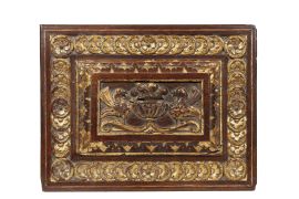 in noce intagliato e parzialmente dorato, coperchio ornato da motivi a fiorellini entro cerchi sovrapposti e ricorrenti a inquadrare al centro una scena che raffigura due colombi ai lati di un vaso entro cornice bombata a foglie e sottofoglie, fronte e retro intagliati a motivo di mascherone dalla cui bocca si dipartono tralci fogliacei, sui lati decori a motivi vegetali inquadrati da cornice a fogliette stilizzate, cariatidi ad ornare i quattro angoli, su base a embricazioni con foglie aperte agli angoli poggiante su piedi di foggia leonina. All'interno vani a giorno di diverse misure e specchio sul retro del coperchio, cm 23x44x34