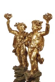 in legno laccato e dorato raffiguranti putti baccanti con corona di foglie in capo, nell’atto di tenere una torcia accesa, stanti su base naturalistica in legno laccato realizzata come un terreno roccioso, alt. cm 154 e cm 148