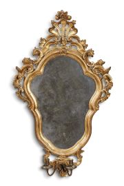 in legno intagliato e dorato, cornice modanata di forma sagomata sormontata da ampia cimasa a giorno a motivo di foglia aperta da cui si dipartono volute che si portano sui lati, al centro inferiore due braccetti si dipartono da una cartella sagomata ornata da volute, cm 80x50