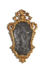 in legno intagliato e dorato, cornice modanata di forma sagomata attorno alla quale si avvolgono tralci fogliacei fioriti che dal centro inferiore si portano simmetricamente verso l'alto a formare la grande cimasa, centrata da volto femminile tra ampie foglie; specchi incisi rispettivamente con le figure di Cupido e Zefiro su piedistallo architettonico sotto una pagoda, cm 128x75