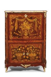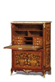 lastronato e intarsiato in legno di amaranto, bois de rose, bois de violette e legno tinto, piano in marmo breccia d’Aleppo con bordo a becco di civetta, fronte con abattant da aprirsi a formare uno scrittoio con piano in cuoio e celante all'interno cinque vani a giorni di dimensioni diverse e sei cassettini disposti su due colonne intarsiati a rametti fioriti, riccamente ornato sul fronte con vaso contenente fiori e trofei su cui poggiano volatili e inquadrato da drappi entro riserva mistilinea, due sportelli sottostanti intarsiati con due ceste di fiori entro riserva sagomata, fianchi di linea lievemente mossa ornati da riserve mistilinee entro profilo rettangolare ciascuna contenente un rametto fiorito, bocchette, angoli superiori, gambe anteriori e pendaglina ornati da applicazioni in bronzo cesellato e dorato in foggia di motivi vegetali, cm 129x97x42.