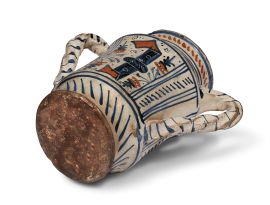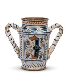 in maiolica decorata in policromia con blu e arancio; alt. cm 21,5, diam. bocca cm 11,7, diam. piede cm 11