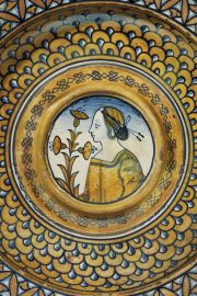 Questo tipo di bacile a lustro fu prodotto a Deruta secondo le modalità utilizzate anche nei piatti da parata, in un periodo che oscilla tra il 1500 e il 1530. Confronti puntuali di bacili da acquereccia con ritratto femminile accompagnato da un fiore di giglio si trovano ad esempio nei musei francesi (J. Giacomotti, Catalogue des majoliques des musées nationaux, Parigi 1974, p. 171 nn. 561-563). Nel nostro caso però il ritratto femminile si distingue per le modalità, che di solito invece riprendono i ritratti di ispirazione dal Perugino, come ad esempio il bacile esposto a Spoleto nel 1982, che condivide con il nostro la decorazione dell’orlo ed è databile alla prima metà del XVI secolo (C. Fiocco, G. Gherardi, Maioliche umbre decorate a lustro, Spoleto 1982, p. 11 n. 35) oppure il bacile conservato al British Museum (D. Thornton, T. Wilson, Italian Renaissance Ceramics, A Catalogue of the British Museum’s Collection, Londra 2009, p. 462 n. 272).