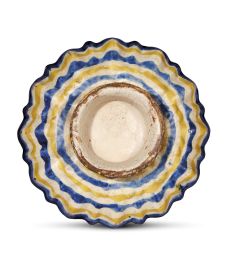 in maiolica dipinta a policromia con verde, blu di cobalto, giallo antimonio, giallo arancio, verde ramina, bruno di manganese; alt. cm 7, diam. cm 23,5, diam. piede cm 11