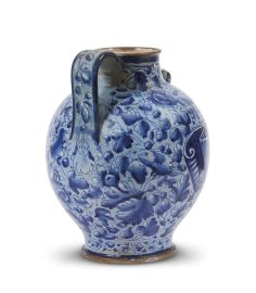 in maiolica dipinta in policromia a fondo azzurro con blu e giallo antimonio. Datato sul retro sotto l’ansa 1573; alt. cm 32,5, diam. bocca cm 10,8, diam. piede cm 15