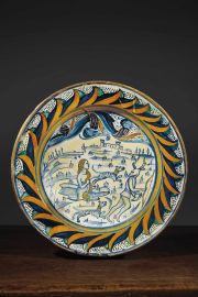 Questa tipologia di piatti fu per lungo tempo attribuita a manifattura faentina, anche se la coincidenza del loro retro con la tipica morfologia derutese ha sempre destato dei dubbi in merito, tanto che le opere affini vantano una consistente mole di studi. Alcuni esemplari con bordura decorata secondo un motivo analogo, ma decoro centrale molto differente, costituiscono un valido raffronto. Il primo confronto ci deriva dal piatto da parata del British Museum, con giovane gradiente con bastone e falce in una riserva circondato da motivi a fiore di briona, uno dei piatti più antichi con decoro mutuato da un’incisione (D. Thornton, T. Wilson, Italian Renaissance Ceramics. A Catalogue of the British Museum Collection, Londra 2009, p. 77 n. 45). Nell’elenco di opere con tipologia decorativa ancora vicina al nostro esemplare, possiamo ricordare anche Il piatto del Victoria and Albert Museum con fanciulli che si arrampicano su un albero con il motto E NON SE PO MANGIARE SENZA FATICA, ma anche il piatto, ancora del VAM (inv. 1806-1855), con allegoria dell’amore crudele, nel quale la scelta dei decori secondari nel cavetto contempla un motivo a foglia gotica (D. Thornton in A. Bayer, S. Cartwright, Art and Love in Renaissance Italy, New Haven 2009, pp. 89-90 n. 22). Numerosi inoltre i frammenti coerenti con queste opere conservati nel Museo Regionale di Deruta.