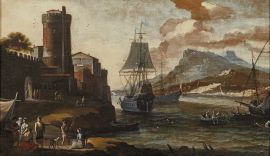 VEDUTE DI PORTO CON VELIERI E FIGURE