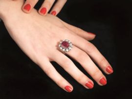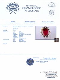 al centro un rubino taglio ovale di ct 5.60, circondato da dieci diamanti taglio brillante per ct 0.70, punzone 750, mis. 15, g 12,69. Corredato di certificato I.G.N, attestante l'origine geografica e l'assenza di trattamenti termici.
