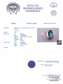 al centro uno smeraldo taglio ottagonale di ct 3.50 circa su montatura impreziosita da piccoli diamanti taglio brillante per ct 2 circa, mis. 13 , g 9 circa. Corredato di certificato I.G.N del 6/2/2019 che ne attesta le caratteristiche.