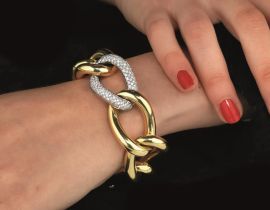 impreziosito da una maglia con pavè di diamanti taglio brillante per ct 2 circa, firmato "Gimor", punzone 750 e del fabbricante, lungh. cm 21, g 93