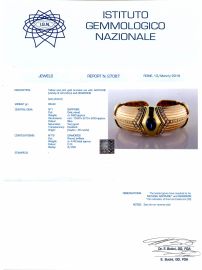 al centro di una fascia rigida in parte scanalata uno zaffiro ovale di ct 9.60, inserti e profili impreziositi da diamanti taglio brillante per ct 4.40 circa, diam. cm 6 circa, g 86. Corredato di certificato I.G.N del 13/03/2019 che ne attesta le caratteristiche e la provenienza geografica.