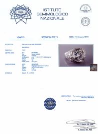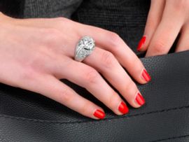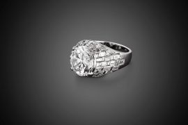 al centro un diamante taglio brillante di ct 6, colore F purezza VS, affiancato da diamanti taglio baguette per ct 5, punzone PT, mis. 15, g 13 circa. Corredato di certificato I.G.N del 14/01/2019, attestante le caratteristiche.