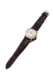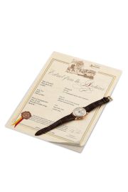 cassa in oro rosa 18kt, fondello a scatto, anse a ragno, quadrante indelebile argentè, movimento cronografo a carica manuale, cinturino in pelle con fibbia originale in oro rosa 18kt. corredato di un estratto degli archivi, vetro plastica. Diam. mm 36