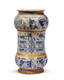 in maiolica decorata in policromia con giallo, giallo ocra, verde, bruno di manganese e blu di cobalto. L’albarello ha forma a rocchetto con centro cilindrico tra due rigonfiamenti arrotondati, il primo terminante in un piede basso con orlo arrotondato e il secondo in breve collo che termina in una larga imboccatura circolare a orlo estroflesso. Il decoro si caratterizza per un doppio ornato utilizzato per far cambiar veste alla credenza farmaceutica, simmetricamente suddiviso tra fronte e retro: da un lato una grottesca simmetrica con figure fantastiche, uccellini dalle lunghe zampe e antefisse raccolte intorno a un cartiglio dall’alta cornice con la scritta apotecaria D.SEB.S. in caratteri capitali, dall’altro una fitta decorazione a “foglia bipartita” in blu e bianco attorno a un cartiglio speculare al primo. Riccardo Gresta in un recente articolo porta l’attenzione su alcuni corredi farmaceutici con emblemi pesaresi, caratterizzati da ornati similari al nostro. Colpisce in maniera particolare la vicinanza, seppur qui maggiormente semplificata, con la modalità di realizzazione del decoro a grottesche con “arpie plastiche di colore azzurro, con marcature ocra e arancio” con al centro una arpia dai grandi seni scoperti, che per l’autore costituisce un topos decorativo ricorrente sia nelle maioliche durantine che pesaresi, che a Casteldurante perdurò per tutto il secolo XVII. Tuttavia la caratteristica decorativa con doppio decoro contraddistingue alcuni grandi orcioli della bottega di Mastro Diomede da Casteldurante, dalla quale provengono in maniera inequivocabile due grandi vasi conservati all’Ashmolean Museum di Oxford (inv. WA 1888.CDEF.C465 e 466). Questa vicinanza, seppure nella semplicità della decorazione della nostra opera che è però in un vaso da unguento di minor impatto nell’insieme farmaceutico, o forse di rintegro, non ci fa escludere una paternità di uno dei pittori durantini presenti a Roma nel corso del secolo XVII; alt. cm 20,5, diam. bocca cm 9,4, diam. piede cm 8,8