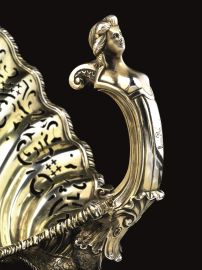 in forma di grande conchiglia con tesa traforata e poggiante su tre piedini realizzati come animali acquatici, presa realizzata come una sirena, cm , g 1280, 29x27x20