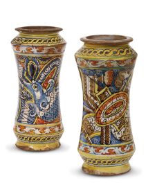 Tuttavia in questi due vasi lo stile pittorico è differente e ritrova confronto in un grande vaso della collezione del Banco di Sicilia di Palermo (G. Croazzo, in R. Ausenda (a cura di), Le collezioni della fondazione Banco di Sicilia. Le maioliche, Milano 2010, pp. 44-45 n. 7), caratterizzato da alcuni elementi decorativi che riconosciamo nei nostri vasi: gli animali fantastici, i trofei nei toni del manganese con elementi curiosi o insoliti, la tavolozza in blu, manganese e rosso mattone, la disposizione della decorazione che, pur mantenendo una collocazione canonica degli elementi, si distingue per caratteristiche stilistiche sia nella definizione dei ritratti, sia nella realizzazione tecnica dei trionfi (R. Daidone, Aromataria. Maioliche da farmacia e d’uso privato. La collezione di Palazzo Abatellis, Palermo 2005, p. 100). Di particolare interesse l’uso del fondo ocra in uno dei due albarelli in esame, in contrasto con il consueto uso del blu di cobalto.