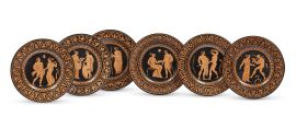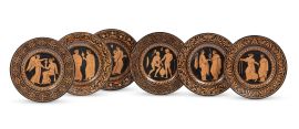 in terracotta opaca rossa a figure rosse su fondo nero. I dodici piatti, coerenti per dimensioni e scelta decorativa, si distinguono fra loro per i soggetti raffigurati e per l’ornato della tesa, costituendo un interessante campionario del decoro a figure attiche cosiddetto “all’etrusca”. La marca impressa nella pasta e accompagnata dalla N di Napoli si riferisce al felice periodo produttivo sotto la gestione di Cherinto Del Vecchio, quando le esportazioni fuori dall’Italia aumentarono. Marca incussa sottocoperta in corsivo Del Vecchio N; diam. cm 20,4