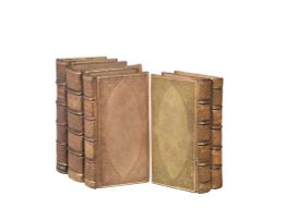 ELZEVIER - LEGATURE. Lotto di 5 opere nc: SLEIDAN, Johann. Ioan. Sleidani De quatuor summis imperiis libri tres. Postrema editione hac accurate recogniti. Lugd. Batavorum, ex officina Elzeviriana, 1631. [CON:] SLEIDAN, Johann. Ioan. Sleidani De quatuor summis imperiis libri tres. Postrema editione hac accurate recogniti. Amstelodami, ex officina Elzeviriana, 1654. 2 volumi in 24mo, entrambi con bellissimo frontespizio calcografico, in vitellino oliva riccamente decorato a secco e in oro, sguardie rosa, tagli dorati. [CON:] POSTEL, Guillaume. Guilielmi Postelli De republica, seu Magistratibus Atheniensium liber. Lugduni Batauorum, ex officina Joannis Maire, 1645. In 16mo in vitellino nocciola riccamente decorato a secco e in oro, sguardie verdi, tagli dorati. [CON:] Gölnitz, Abraham. Vlysses Belgico-Gallicus, fidus tibi dux et Achates, per Belgium Hispan. regnum Galliæ, ducat. Sabaudiæ, Turinum usq. Pedemont. Lugduni Batauorum, apud Franciscum Hackium, 1631. In 16mo con frontespizio inciso, sottoscritto “Cornelis Cl. Dusend sculpsit”, in vitellino nocciola riccamente decorato a secco e in oro, sguardie verdi, tagli dorati. [CON:] Respublica Lutzenburgensis, Hannoniae, Namurcensis. Amsterdami, apud Guijlielmum Blaeu, 1635. In 24 con frontespizio inciso, in vitellino nocciola decorato a secco e in oro, sguardie rosa, dentelles e tagli dorati.