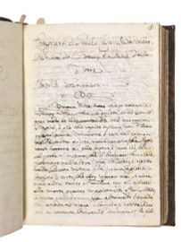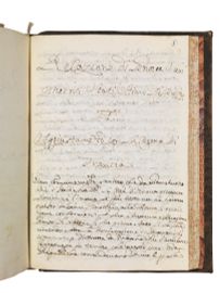 Manoscritto cartaceo (200 x 145 mm) in 4 parti scritte dalla stessa mano in bella grafia leggibile, la prima in [118] pp. non numerate, la seconda in 190 pp. numerate, la terza in 240 pp. numerate, la quarta in 99 pp. numerate, per un totale di circa 650 pagine. Legatura coeva o di poco posteriore in piena pelle, dorso a nervi con titolo “CONGIURA DI GENOVA” in uno scomparto, gli altri decorati in oro, tagli spruzzati, contropiatti marmorizzati. Macchia d’olio al margine della prima opera, tracce del tempo alla legatura, per il resto buono stato di conservazione.