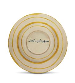 in maiolica decorata in policromia con blu di cobalto, giallo antimonio, giallo arancio, verde ramina e bruno di manganese. Il piatto ha profondo cavetto e larga tesa obliqua con orlo arrotondato, il retro poggia su un basso piede ad anello appena accennato, al centro del quale è delineato in corsivo in blu di cobalto la scritta David et golia gigante. Sul fronte una scena istoriata con diversi episodi rappresentati su più piani. Nel consueto paesaggio aperto si intravvedono sullo sfondo le tende di un accampamento e più lontano un paesaggio con montagne e cielo al tramonto: delle truppe escono dall’accampamento per inseguire un esercito in fuga, visibile sulla sinistra tra gli alberi; al centro della scena, con un alberello spoglio a fare da quinta, Davide nell’atto di decapitare il gigante Golia, esanime a terra colpito dalla fionda, a terra vicino al gigante. L’opera per stile e decoro ha riscontro nelle migliori interpretazioni su forme aperte della bottega di mastro Domenico, pittore di cui conosciamo solo pochi esemplari firmati, tra i quali un piatto con la stessa scena conservato in una collezione privata americana e studiato da Elisa Paola Sani, che tra l’altro individua la fonte della raffigurazione in un’incisione di Étienne Delaune (1518-1583); alt. cm 5,5, diam. cm 29,8, diam. piede cm 11,5
