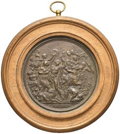 Ae mm. 87,50 (senza cornice) D/ Busto a d. Sotto la troncatura del busto M SOLD R/ Bacco stante con una coppa nella d. e un tirso nella s.; a d. Sileno in groppa ad un asino e intorno satiri e baccanti in festa. Esergo CANEBAM. Vannel-Toderi 36