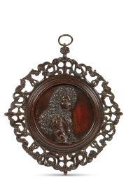 in bronzo di forma circolare centrati da rilievi con busto di gentiluomo entro ricche cornici con modanature e larga fascia traforata a motivi vegetali stilizzati, cm 18,5x16,5