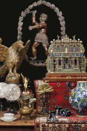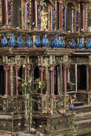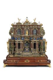 Appoggiato su di una base in legno sagomato, si erge questo bello e scenografico modelletto di Chiesa barocca, eseguito in vetro da abili artigiani, attenti ad ogni possibile dettaglio, dagli alberi di agrumi posizionati sul piazzale, alle colonnine a strisce verticali con relativi basi e capitelli, alla balaustra composta da leggiadri montanti azzurri, fino alla miriade di decorazioni a rocailles, festoni di fiori e foglie e specchi sparsi per l’intera costruzione. Una vera opera d’arte, abbellita da fregi e sculture in bronzo finemente cesellato e dorato.