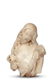 In un articolo del 2012 la studiosa Laura Cavazzini ha avanzato l’ipotesi che in questa figura femminile dal volto addolorato possa riconoscersi una delle testimoni della Passione di Cristo, la Maddalena o forse anche la Madonna stessa. La figura, mancante delle mani, è scolpita ad alto rilievo e la superficie piatta del retro fa supporre che si stagliasse in origine contro un fondale e che fosse parte di un gruppo scultoreo, come una Pietà o un Compianto sul Cristo morto. Secondo quanto ipotizzato nello studio della Cavazzini, l’opera in esame potrebbe essere riferibile allo stesso misterioso autore di tre altorilievi custoditi nella chiesa di San Bassano a Pizzighettone, in provincia di Cremona, raffiguranti scene della vita di Cristo, più precisamente l’Annunciazione, la Natività e l’Adorazione dei Magi. Il ritmo gotico dei panneggi, il chiaroscuro vibrante e i tipi fisionomici stilizzati fanno ipotizzare che autore di queste sculture sia un maestro transalpino attivo in Italia all’inizio del Trecento. L’ignoto scultore lavorò al tempo di Azzone Visconti, committente dei rilievi, come si evince una targa murata nella cappella. Al cosiddetto “Maestro di Pizzighettone” potrebbe dunque essere attribuito anche il nostro rilievo in marmo, grazie ad elementi quali il vigore di intaglio e il velo che aderisce alla testa della figura, nota distintiva dello scultore. E vi è anche l'ipotesi che potesse far parte dello stesso complesso da cui provengono i marmi della chiesa di San Bassano.