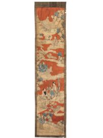 in seta “tesi” con sfondo rosso decorata con figure sin un esterno; cm 190x40,5 (2)