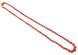 composta da sfere di corallo degradanti da mm 12 a mm 5, chiusura in oro giallo con spola di corallo, lungh. cm 63, g 36