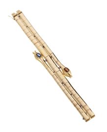 composta da collana e bracciale semirigidi in oro rosa, a forma di serpenti, impreziositi da un rubino, uno zaffiro ed un granato, punzone 750 e del fabbricante, lungh. collana cm 44,5, lungh. bracciale cm 19,5, g lordi 159 circa