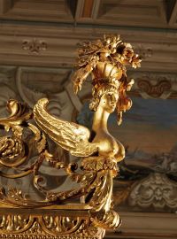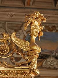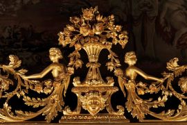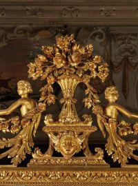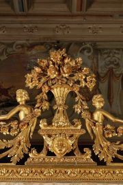 in legno intagliato e dorato, rivestito in raso color tortora operata a motivo di fiori con analoghe tende. Parte interna del baldacchino profilata da fascia in legno dorato intagliata a fogliette e ornata al centro da cornice di forma ovale intagliata a ovoli a inquadrare una cupola decorata a rametti fioriti scolpiti, parte esterna sormontata su tre lati da cornice intagliata a mezze foglie rivolte verso il basso tra archetti rovesciati, sulla quale si applica l’ampia fascia riccamente scolpita a giorno con vaso di fiori al centro, poggiante su mascherone tra due figure femminili di profilo in atto di sorreggere tra le mani tralci fioriti che si portano verso gli angoli, dove protomi femminili dalle ampie ali sorreggono sulla testa vasi fioriti; base non pertinente modanata in legno laccato su fascia dorata intagliata a motivo di fogliette poggiate su zampe leonine, cm 350x230x260