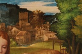 Gli splendidi brani paesistici che fanno da sfondo alle Sacre Conversazioni di Pietro degli Ingannati richiamano invece l’esempio folgorante di Giorgione nella sua breve parabola entro il primo decennio del Cinquecento: ed è appunto agli edifici rustici sullo sfondo del Concerto Campestre che si rifanno quelli a destra nel nostro dipinto.